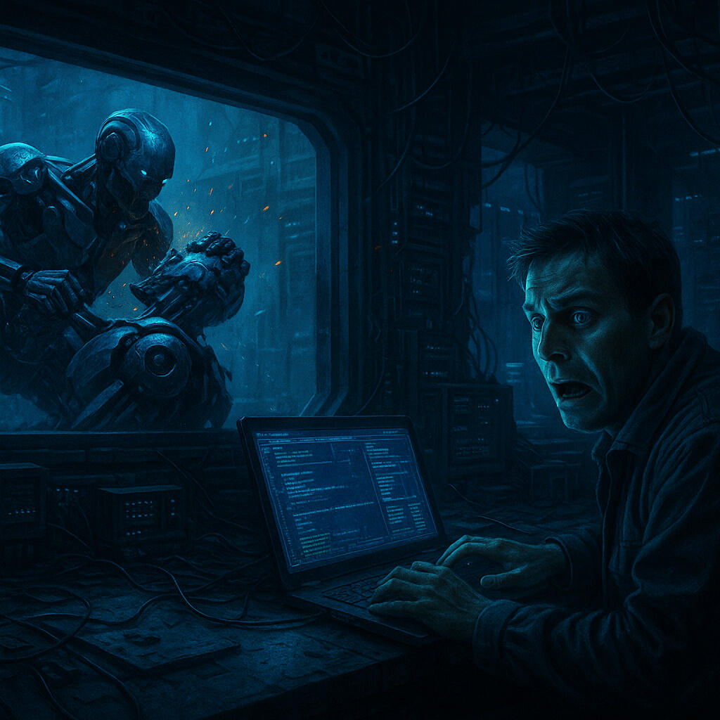 Then the contradiction emerges. Humans try to use technology itself to destroy it. They raise digital weapons, create systems to break systems. But each attack only strengthens the prison. The more they fight against the machine, the more they become part of it. The paradox is inevitable: the machine is built to resist, and it grows by devouring its enemies.