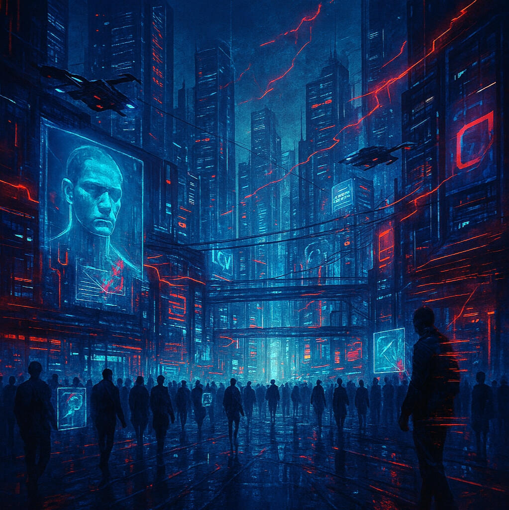 Nothing you see is your choice. The voices, the ads, even the nightly dreams, all programmed by invisible codes. Every step is measured, every breath predicted. There is no more chance, no more freedom. The city around pulses like an ordered hive, but the faces walk in silence, repeating desires that were never their own. The world has become a single nation, governed by the algorithm.