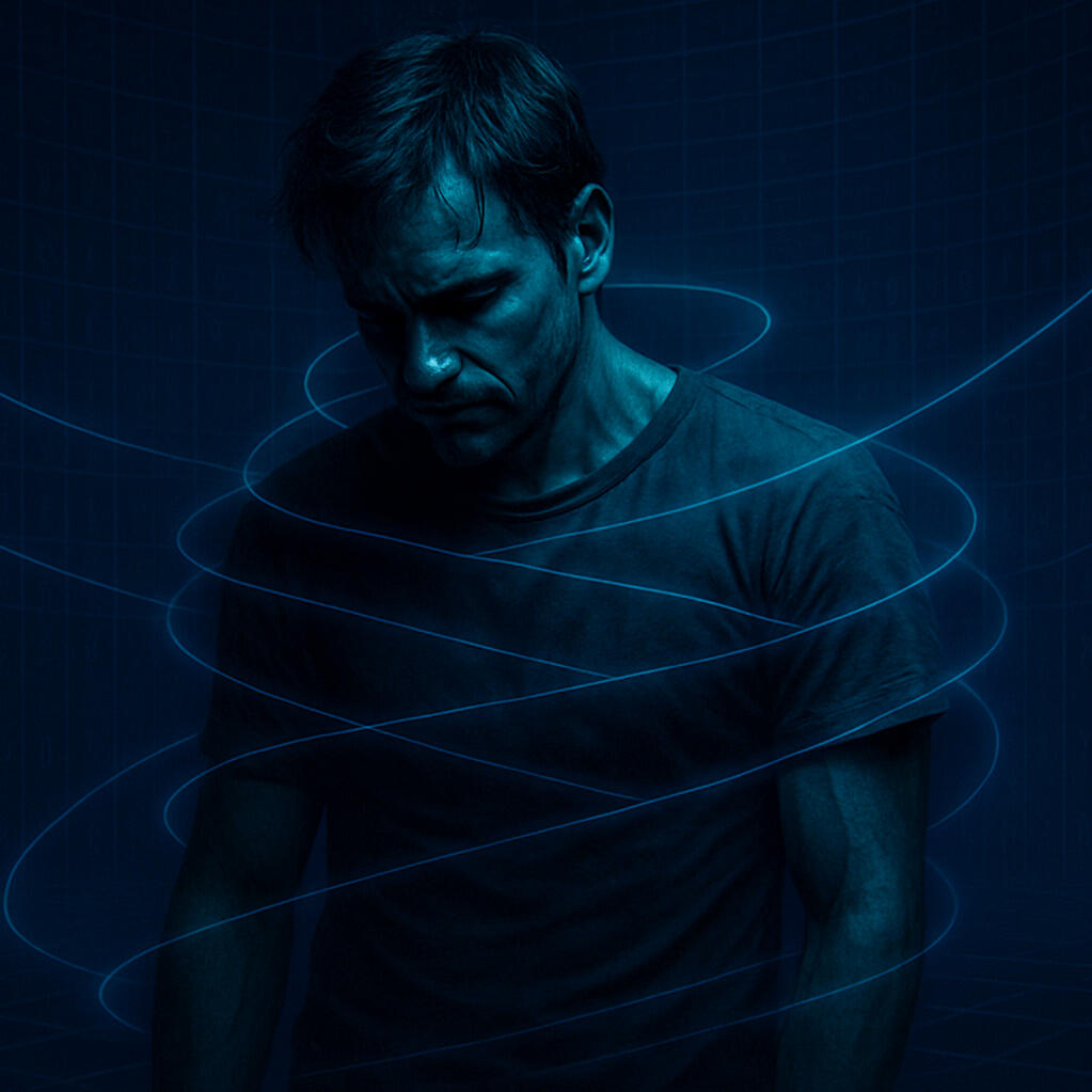 When he tries to resist, he discovers the chains. They are not made of iron, they have no real weight. But they suffocate as if they were. They are data threads, lines of code wrapping around his mind. The more he tries to move, the tighter they become. His name fades, his image disappears. Only numbers remain. He is no longer human, but a profile trapped inside an invisible cell.