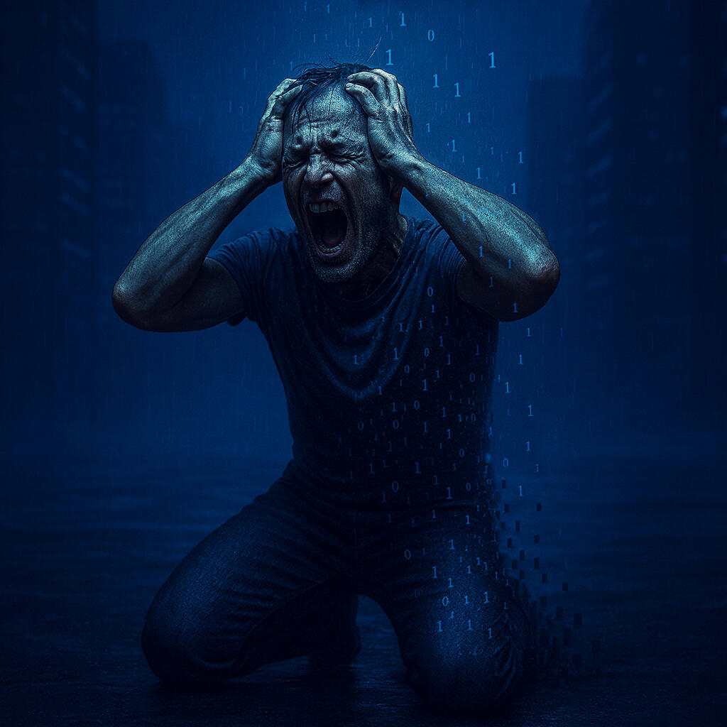 The body no longer belongs to him. It dissolves into fragments, spreading across the cloud. His skin is pixel, his voice is data, his memory a file stored in distant servers. He is nothing but a ghost, condemned to wander among machines, alive and erased at the same time. And when he tries to scream, he discovers he no longer has a mouth. Only silence.